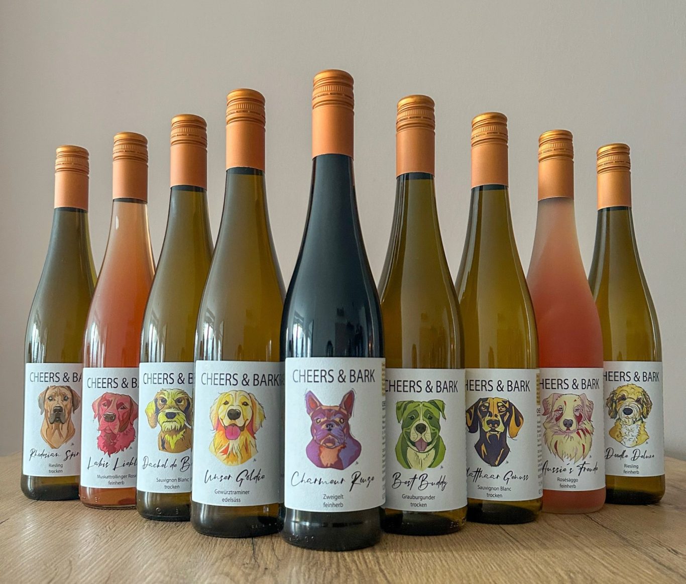 Entdecken Sie die besonderen Produkte von CHEERS AND BARK – mehr als nur Wein. Unsere hochwertigen, veganen Qualitätsweine erzählen Geschichten und verbinden Genuss mit Verantwortung. Jedes Hundeporträt auf den Etiketten wurde mit Liebe handgezeichnet und perfekt auf die jeweilige Weinsorte abgestimmt.